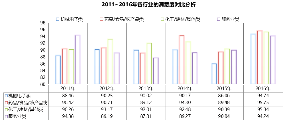 從近六年的滿意度對比來看,2016年機械電子類、藥品/食品/農(nóng)產(chǎn)品類、化工/建材/其他類的顧客滿意度均達到最高點,值得表揚,與去年相比,今年的顧客滿意度均有較大幅度的提升,應(yīng)繼續(xù)保持。