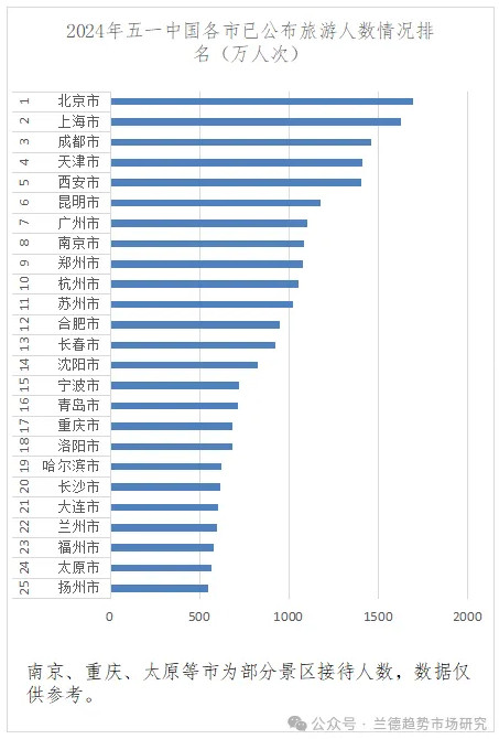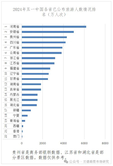 文旅部數(shù)據(jù)顯示,五一假期5天全國國內(nèi)旅游出游2.95億人次。根據(jù)公布數(shù)據(jù),2024年五一期間旅游人數(shù)省排名中,河南、安徽、貴州、四川、廣東五省旅游人數(shù)絕對值排名前五,江蘇省由于統(tǒng)計樣本僅限于部分景區(qū)在整個排名中暫居第八;市排名中,北京、上海、成都、天津、西安絕對值排名前五,南京市統(tǒng)計樣本僅限于部分景區(qū)在整個排名中暫居第八。